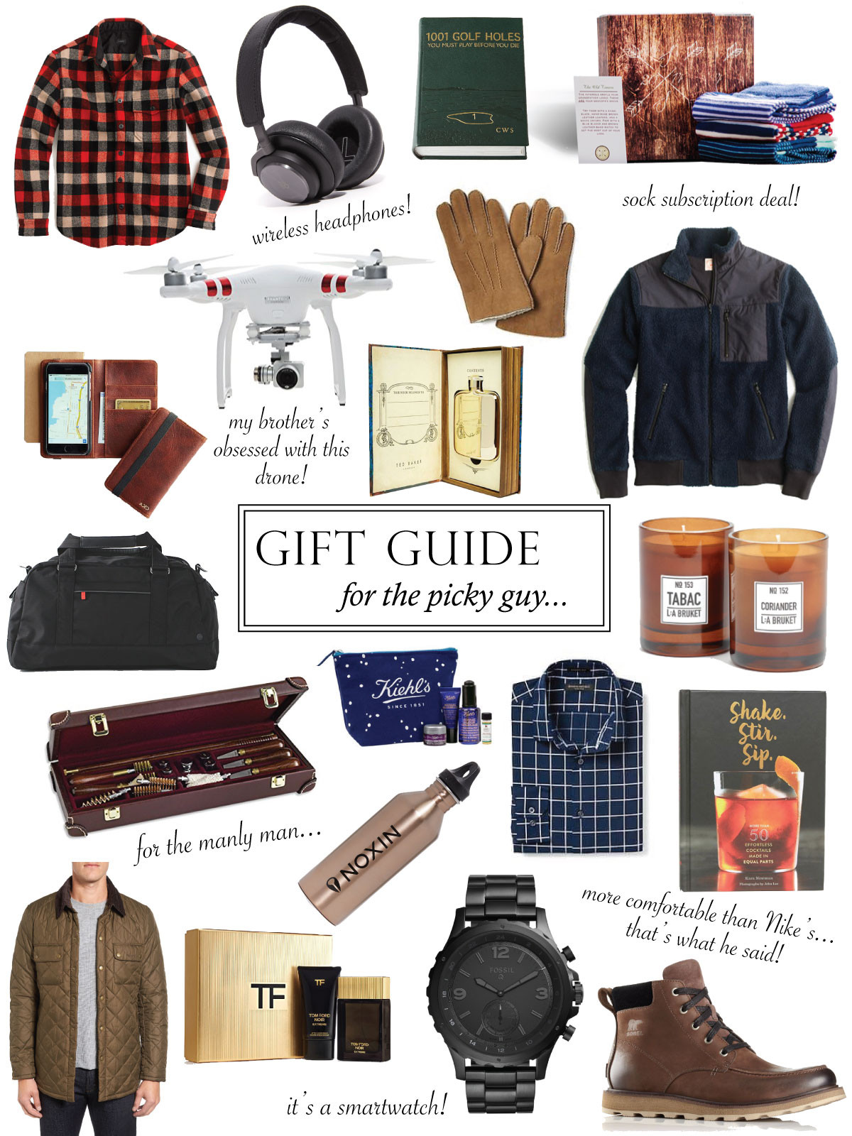 PLAID SHIRT JACKET // WIRELESS HEADPHONES // GOLF BOOK // SOUTHERN SCHOLAR SOCKS (use discount code OSB50 for 50% off first month!) // PHANTOME DRONE WITH CAMERA // SHEARLING GLOVES // FLEECE ZIP UP // LEATHER IPHONE WALLET CASE // GOLD FLASK // LULULEMON DUFFLE BAG // CORIANDER CANDLE // GUN CLEANING KIT // KHEILS OVERNIGHT ESSENTIALS // NAVY WINDOWPANE SHIRT // COCKTAIL BOOK // QUILTED COAT // TOM FORD COLOGNE // FOSSIL Q SMART WATCH // SOREL BOOTS